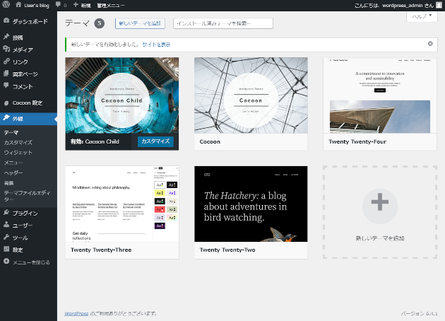 以上で Cocoon の親子テーマがインストールできたので、Cocoon子テーマを有効化します。