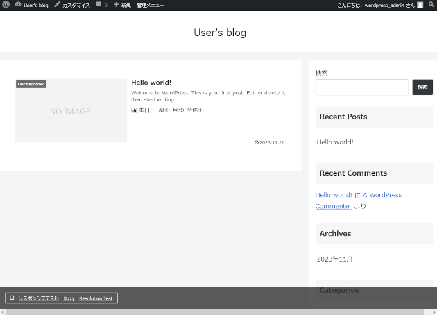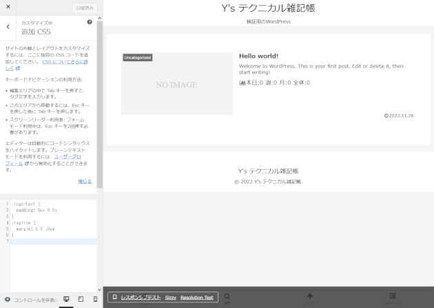 画面左上の家アイコンで確認すると、タイトルとキャッチフレーズの間隔を小さくしたくなったので修正します。筆者が調べた範囲では、CSSに記述するようです。一番上にあるメニューバー?の「管理」メニューから「カスタマイズ」を選択します。左側のメニューから「追加 CSS」を選択します。CSS コードを追加できるエディタが表示されるので、そこに