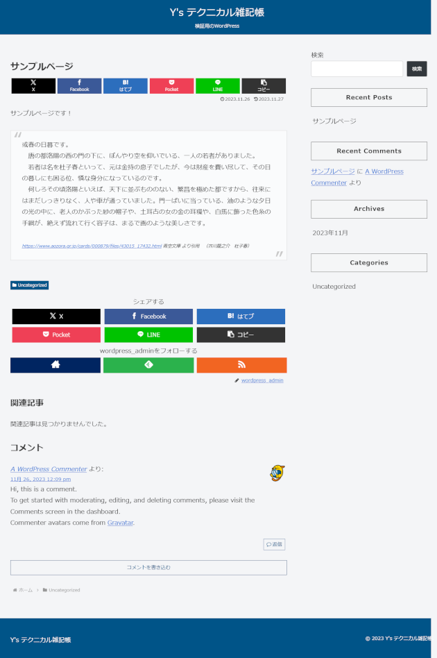 筆者は、X や Facebook をやっていないので、投稿の上部と下部に付いているリンクボタンは不要です。「Hello world!」の投稿をちょっと変更してみた後の、リンクボタンを消す前の画面は次になります。