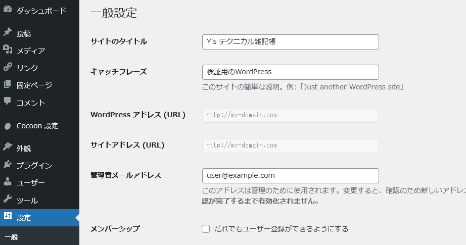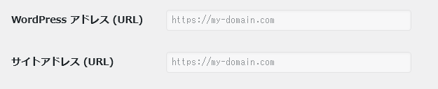 筆者の環境で調べたところ、「WordPress アドレス (URL)」および「サイトアドレス (URL)」は、wp-config.php で設定されています。それぞれ定数名は、WP_HOME, WP_SITEURL です。これらの値はデータベースに持つこともできます。wp-config.php で設定している場合は、それを優先して、データベースの値は無視されます。ちなみに、データベースの値は次の通りでした。