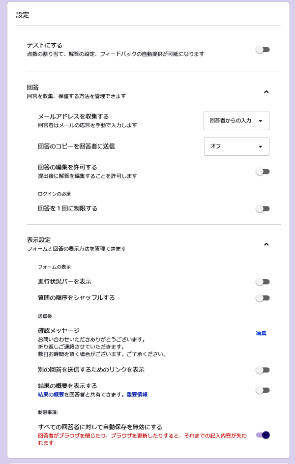 「すべての回答者に対して自動保存を無効にする」は ON です。