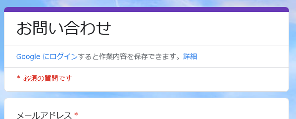 自動保存を無効にしない場合は、次のように「Google にログインすると作業内容を保存できます」の文言が表示されます。この機能は、質問項目が大量のアンケートフォームなら、回答者にとって便利でしょう。今回作成している問い合わせフォームでは無くて良いです。また、GFを良く知らない人にとっては、何か不安を感じる可能性があると思うのです。