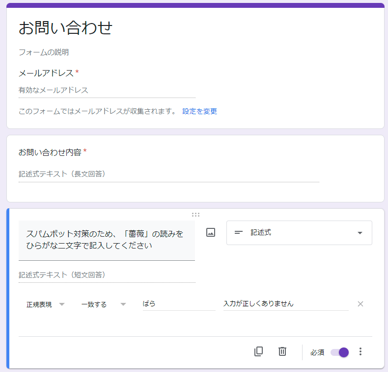 筆者は「Google Forms」の設定は初めてになります。わかってしまえば簡単ですが、結構混乱しました。例えば、お問い合わせフォームで問い合わせ内容を記入するテキスト入力エリアには、「回答を入力」とグレーのガイド文字が表示されます。問い合わせ内容を記入するのに「回答」とは何だ?という感じです。アンケートフォームだったなら、質問に対しては回答とするのが自然ですが。