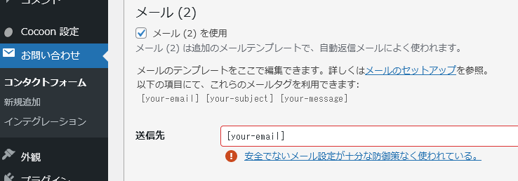 エラーの部分には、赤!マークと説明へのリンクがあるので参照してみました。大雑把にまとめると、このままではスパムなどで悪用される恐れがあるので、スパム対策のプラグインと統合して使用する。最善なのは、メール(2) – 問い合わせ者への控えメール送信 – の設定をしない。(正確には原文を参照ください)