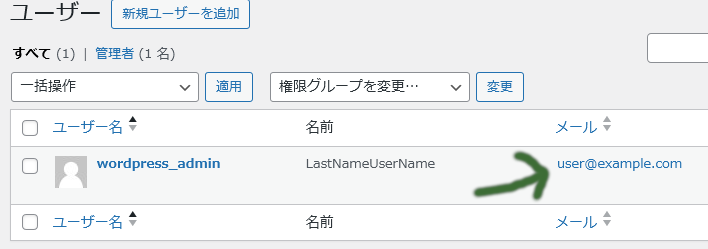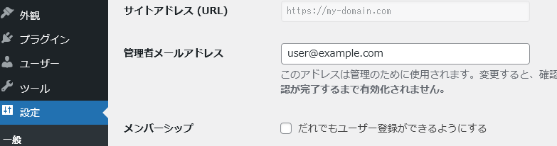 先ほど、管理者のメールアドレスは変更したつもりになってましたが、ここにもメールアドレスがありました。これも修正します。メールアドレス変更のメールが来るので、リンクにアクセスして変更を確定します。これで、user@example.com 宛のメールは送らなくなるので、不達メールが来なくなります。