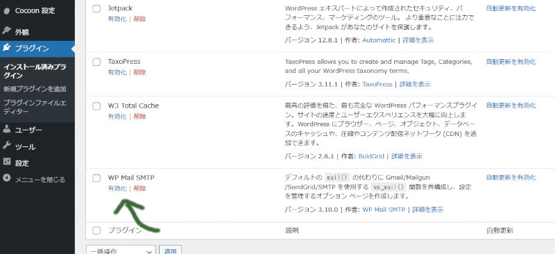 筆者がインストールした WordPress には、最初から「WP Mail SMTP」がインストール済みでした。「プラグイン」メニューを選択して、「WP Mail SMTP」の「有効化」を選択します。