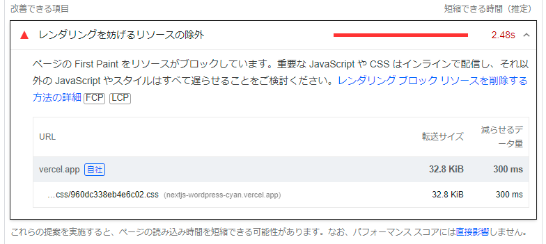 筆者は Webフォント(Google Fonts)を導入しています。Next の公式ドキュメントには、フォントの最適化について説明があります。もう一度良く読んでみると、Local Fonts についても記述があったので、この方式に変更したところパフォーマンス問題は解決しました。何やら良く分かっていなくて申し訳ないですが、ともかくレンダリングブロックは解消できました。