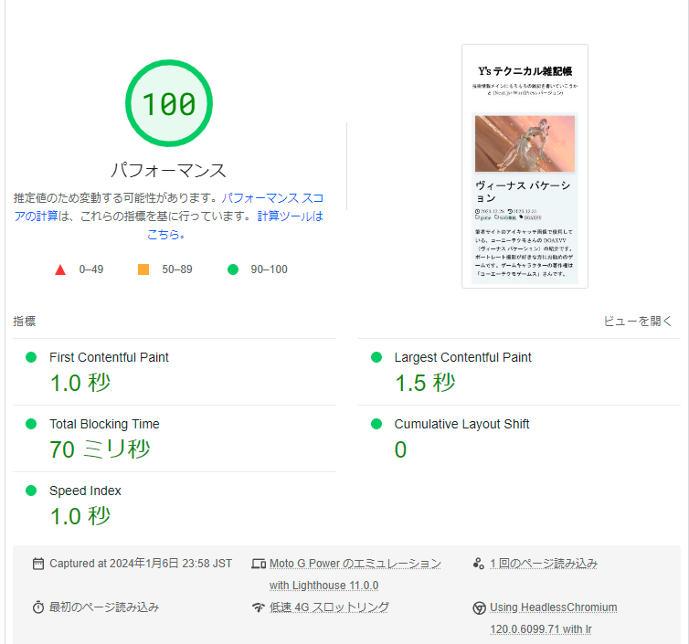 実験として PageSpeed Insights の携帯(スマホ)パフォーマンスを満点 (100) になるまでチューニングしたので、その作業内容について記事にしてみました。主に LCP と TBT について改善しています。少しでもパフォーマンスチューニングの参考になれば幸いです。